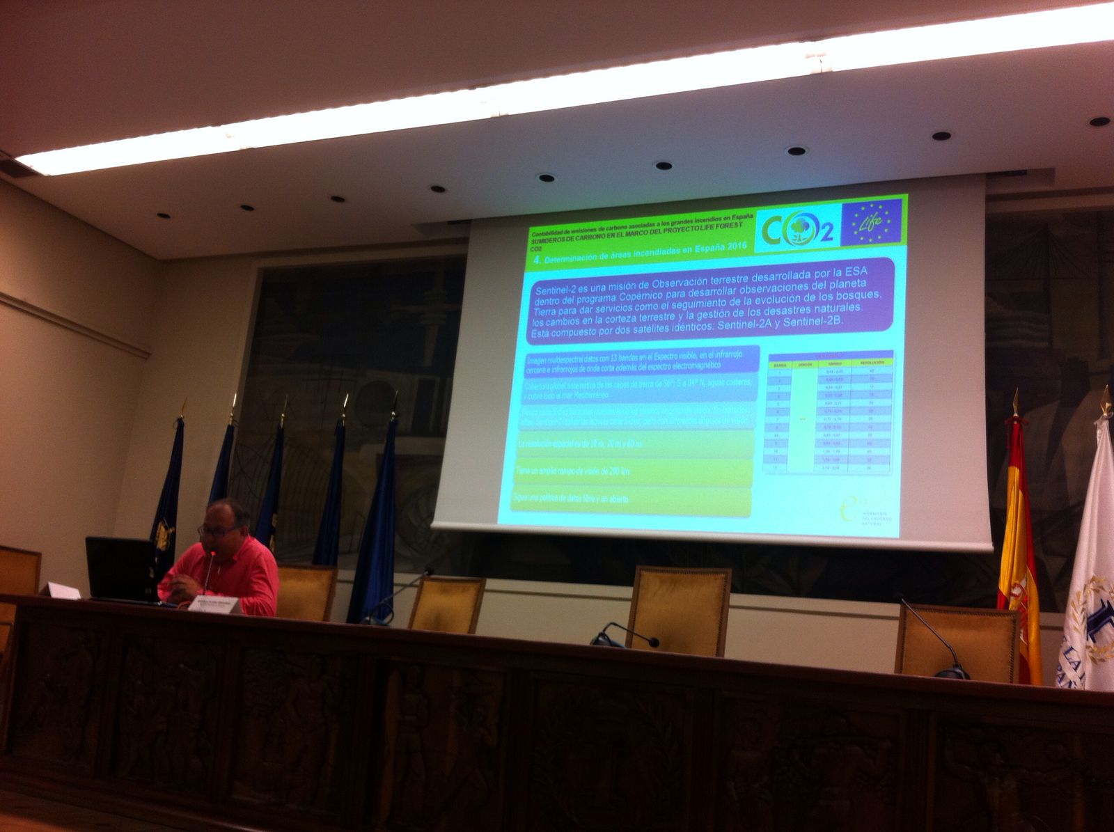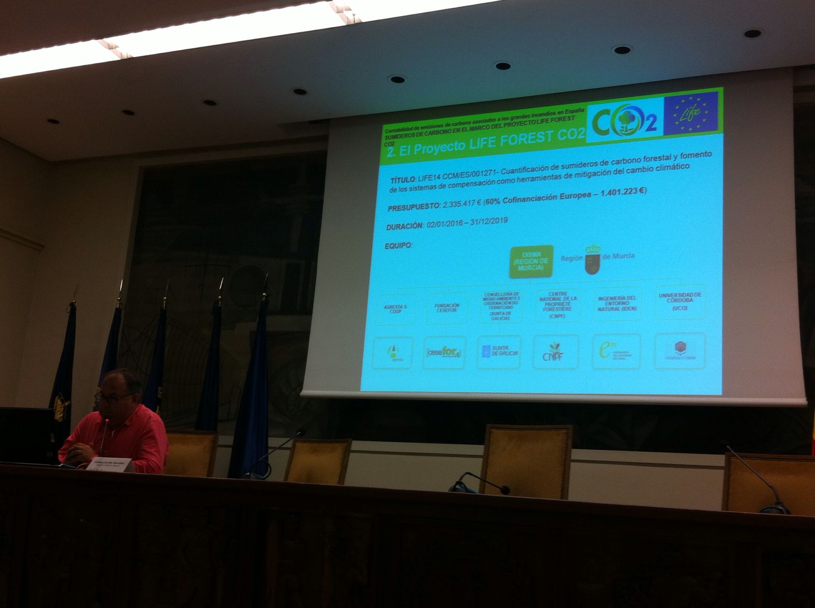Tras estas dos exposiciones, Esteban Jordán introdujo a los asistentes el proyecto LIFE FOREST CO2, dando a conocer sus objetivos, acciones y resultados esperados. Una parte fundamental de la exposición consistió en la necesidad de la gestión de los bosques como clave en la mitigación del cambio climático, ya que sumideros de carbono de gran importancia en la mitigación del cambio climático como son los bosques, pueden desaparecer debido a incendios forestales. Esta parte, con el objetivo de divulgar y concienciar sobre los efectos de los incendios en el cambio climático, se centró en la estimación del CO2 emitido a la atmósfera por los grandes incendios forestales de 2016, y su equivalencia en emisiones expresadas en datos relativos a actividades de la vida cotidiana.